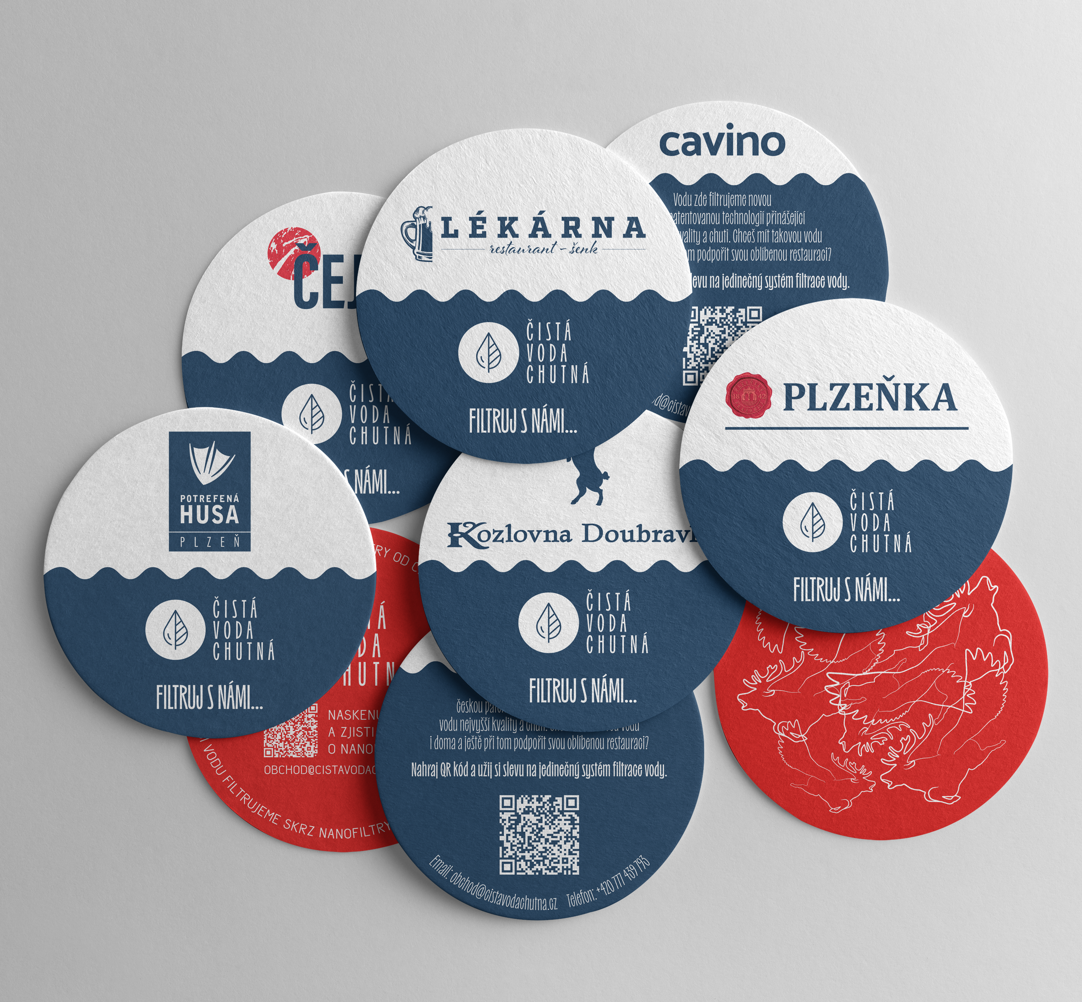 Výroba podtácků na filtrovanou vodu s oboustranným potiskem včetně fungujícího QR kódu na zadní straně.