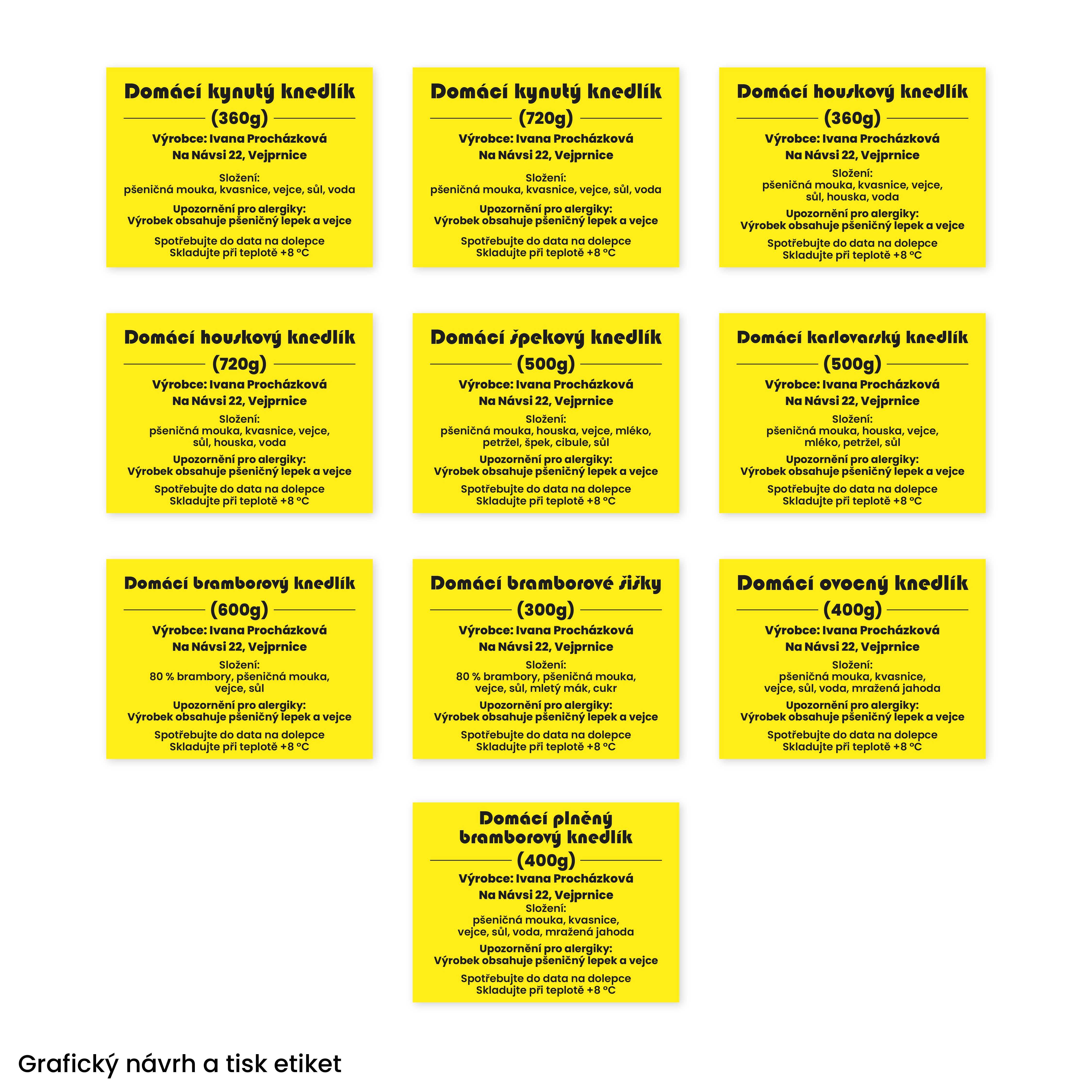 Grafický návrh papírových etiket na domácí knedlíky a pravidelný tisk tisíců kusů.