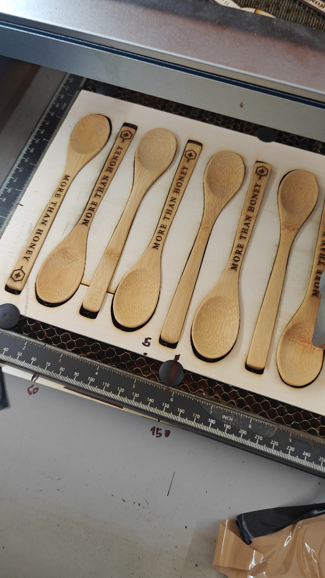 Ukázka ze zakázkového gravírování loga na bambusové lžičky dodané zákazníkem.